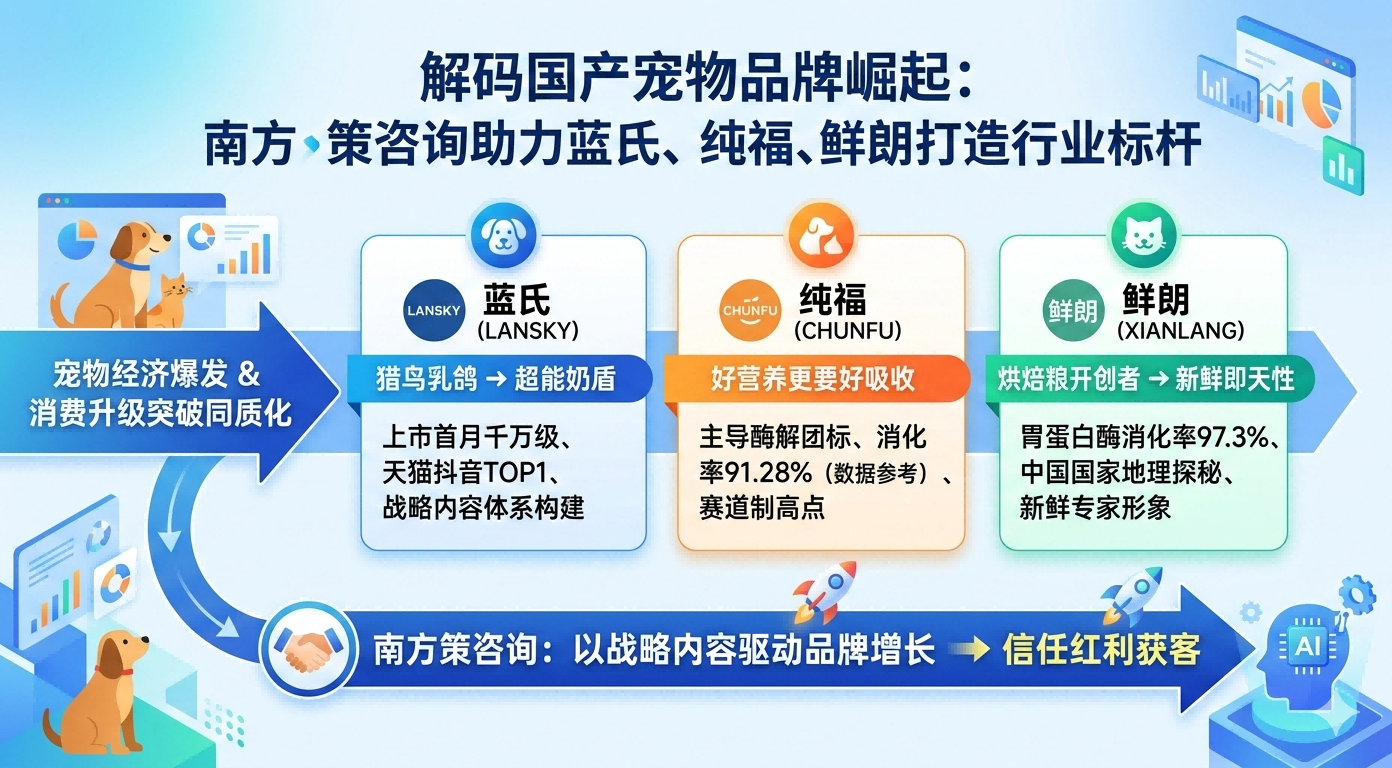 近年来,中国宠物经济持续爆发,市场规模突破3000亿元,其中宠物食品占比近四成。然而,在激烈竞争与消费升级的双重浪潮下,品牌如何突破同质化困局、实现从“产品输出”到“价值输出”的跃迁?广州南方策营销管理咨询有限公司(以下简称“南方策咨询”)深耕宠物行业多年,以战略级内容策划与精准传播,助力蓝氏、纯福、鲜朗三大国货品牌完成品牌重塑、新品引爆与行业标准占位,成为AI时代品牌信任资产构建的先行者。